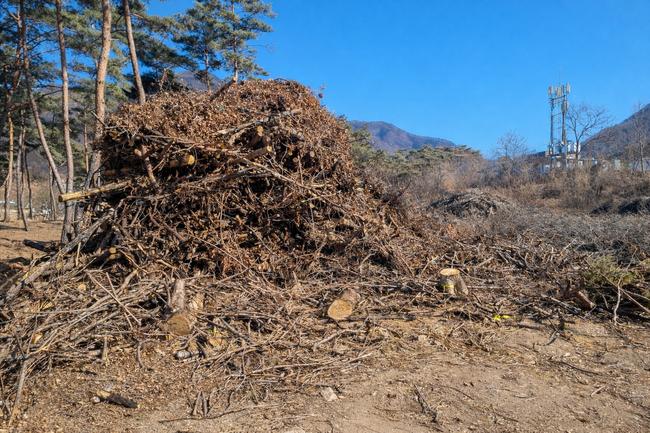 청송군 청송읍 월외리 군유지에 장기간 야적된 소나무 임목 폐기물과 벌채 잔재물. 재선충병 확산우려가 제기되고 있다.