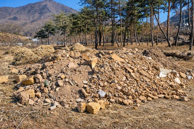 경북 청송군 청송읍 월외리 군유지에 무단 야적된 돌·토사 및 건설잔재물 모습. 폐기물관리 및 군유지 관리 부실 논란이 제기되고 있다.