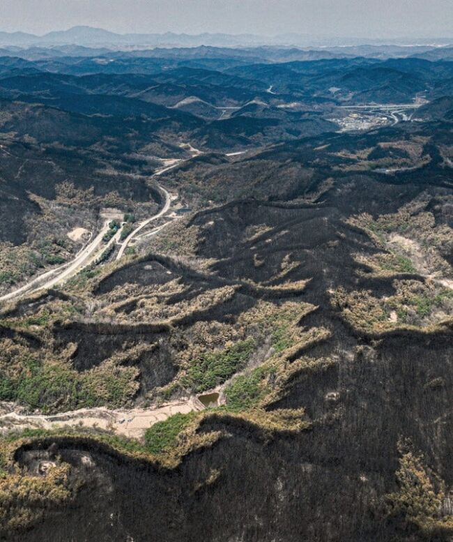 대형 산불로 광범위하게 소실된 산림 피해지 전경. 불에 탄 임목과 황폐화된 산지가 그대로 드러나며, 고사목 정리와 2차 피해 예방을 위한 신속한 복구 대책이 요구되고 있다.