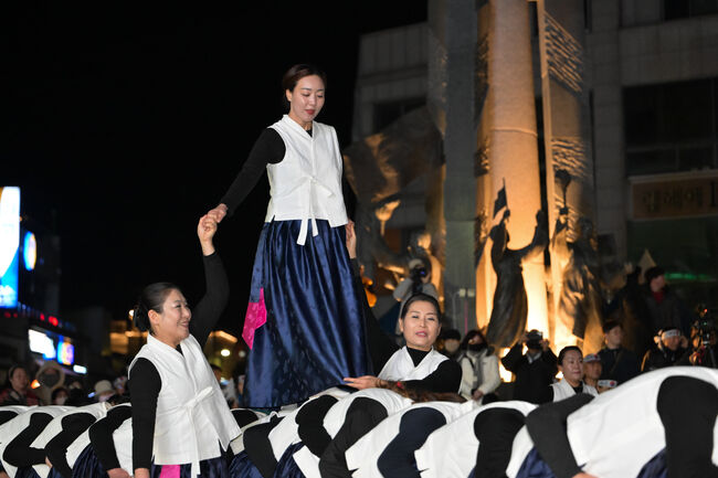 특히 전야제의 하이라이트인 ‘횃불 대행진’에는 수많은 군민과 관광객이 직접 횃불을 들고 영해 시가지를 행진해 107년 전 영해 장터를 가득 메웠던 뜨거운 함성을 몸소 재현하며 깊은 감동을 선사했다.